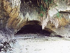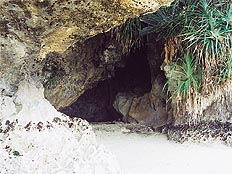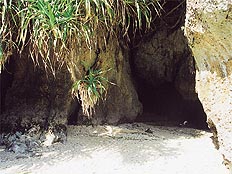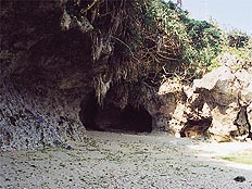 さて、明けて1945年(昭和20)は、正月早々から空襲が始まり、瀬名波や長浜の人々はここの洞窟群を避難所にしました。やがて3月も末になりますと空襲はいよいよ激しくなり、艦砲射撃(かんぽうしゃげき)も加わるようになりました。その頃になると、瀬名波や長浜の人々だけでなく、村内の他字の人々も避難していたということです。