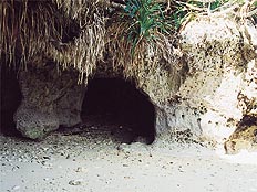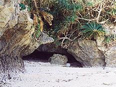 長浜集落から残波岬にかけての海岸線は、隆起珊瑚礁(りゅうきさんごしょう)の段丘が海にせり出しています。段丘(だんきゅう)の下、波打ち際近くにはいくつかの海食(かいしょく)洞窟があります。それらの洞窟が共同避難所となった洞窟群です。